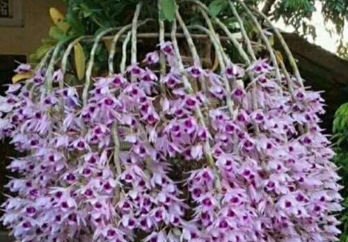 檀香石斛在生长季节末由营养生长转向生殖生长,叶片脱落,在上年生长的茎上抽生花序,2~3朵一束,花为粉红色,直径约5cm,有檀香味故名“檀香石斛”,于4、5月份开花,每年只开1次。檀香石斛,可用分株、扦插、压条、播种等方法繁殖。也可以用无菌繁殖法,一年半至二年即可开花,扦插繁殖时可将谢花后的花茎骨剪成长约6cm带两个节的插条,浸水1-2小时后用1000倍的多菌灵消毒,稍阴干后铺于湿润的水草上,然后移至阴凉处,以后保持湿润,一个月后即可发芽长新根。当芽高约4cm时便可移至直径为3~4cm的小盆,待其长至约10cm时便可移至直径约12cm的吊盆,并用细绳绑着固定以防倒伏;或当芽长至6~7cm时直接移至吊盆,其方法相同。如水肥供给适宜,栽培管理生长甚快,约二年即可开花。