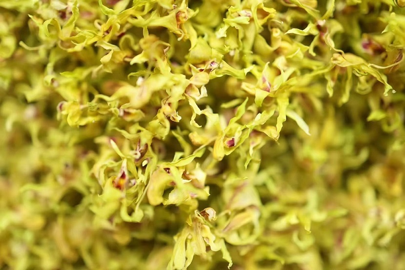 新鲜铁皮石斛花很难保存,因此通常是把其加工成干品,采用的加工方法是冻干和烤干,都是在鲜花采下来两小时内急速干燥处理,以保存石斛花的形态和有效成分。我们在采购的时候可以选花色青绿色、花形态保存好的石斛花。比起铁皮石斛,其花更适合日常的泡茶保健。首先,它保留了原植物铁皮石斛的药用价值;其次,它还有花草的特性,轻清,疏达,解郁,不伤胃,不伤正气。